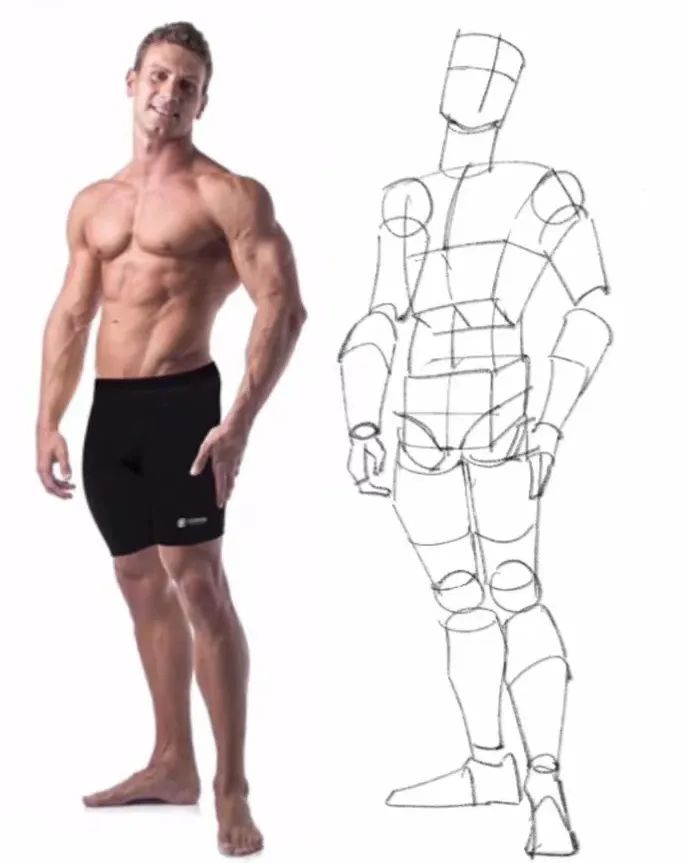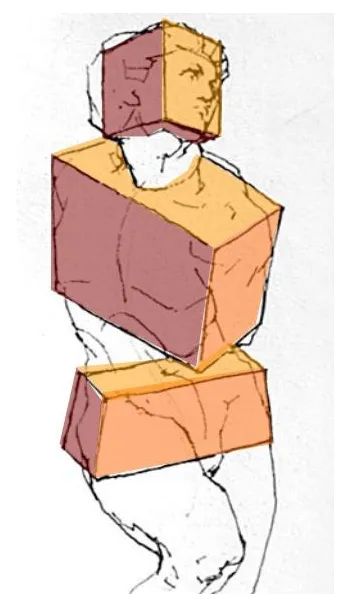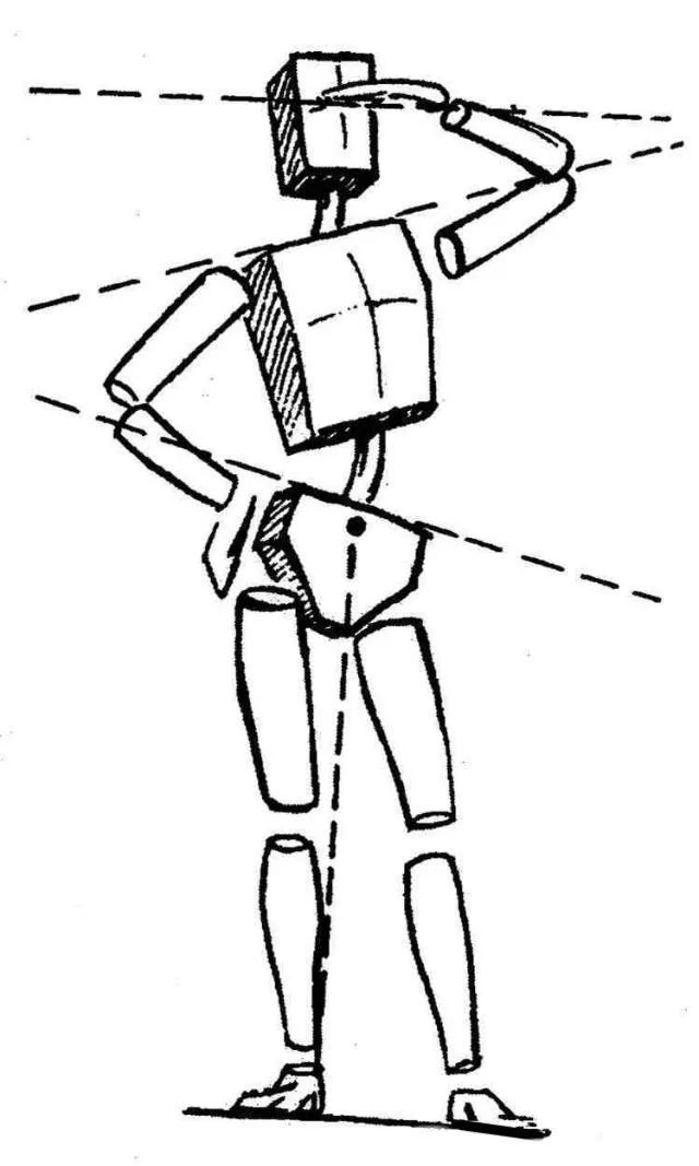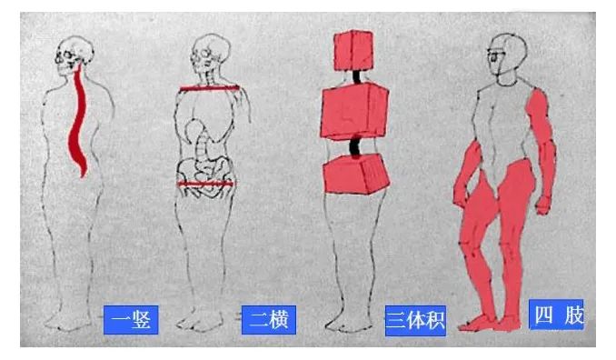 三體積:頭、胸、骨盆。三體積的位置和朝向變化顯示了軀干的基本形態。四肢:上肢與下肢。四肢的運動方向不同與身體形成不同的角度。