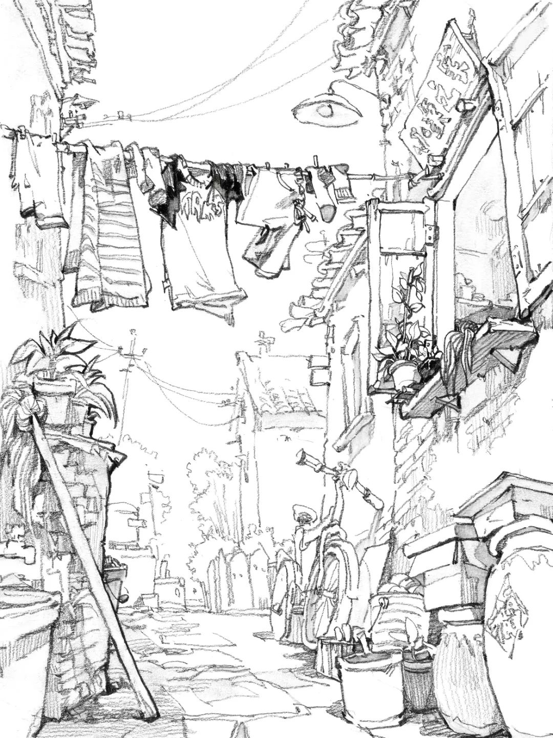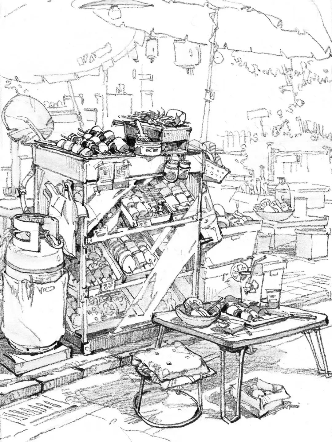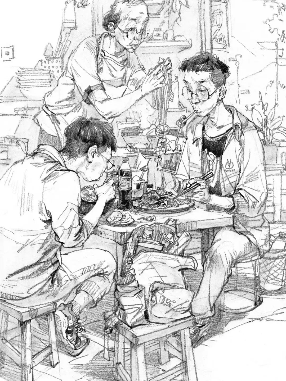 速寫的場景氛圍烘托主要是靠增添多層次、豐富的道具,人物之間的聯系等來襯托主體所處的情境,通過穿插、前后擺放形成一種耐人尋味的構成感。想象自己是置身于所畫場景的第一現場,作為記錄者去畫腦海中所浮現的充滿故事性的畫面,這樣能夠更精準地塑造默寫中的場景。