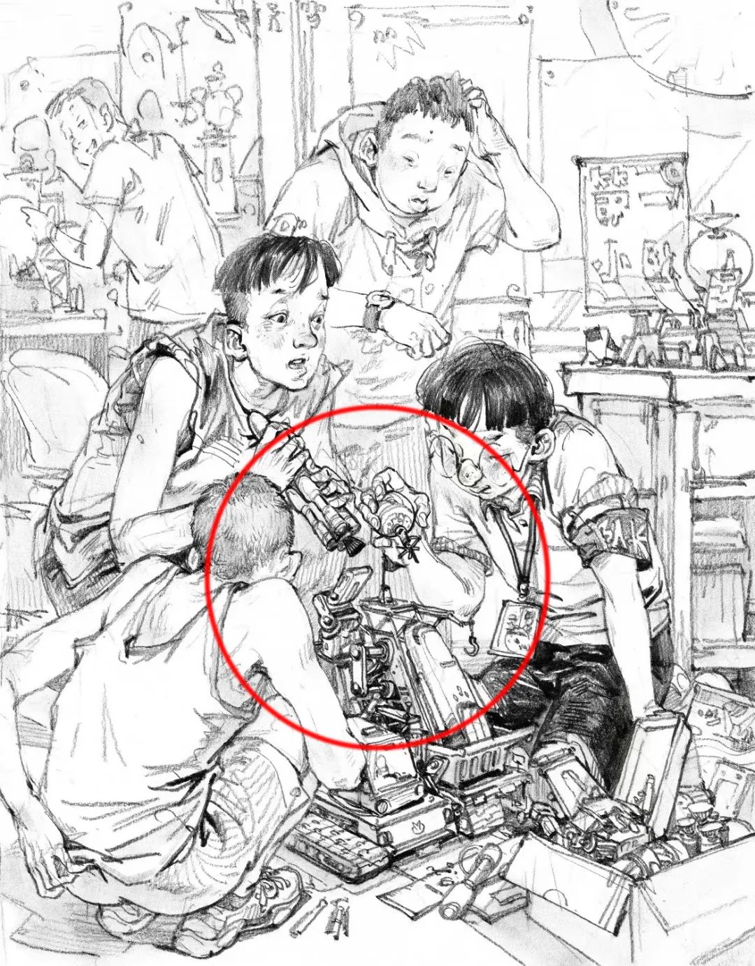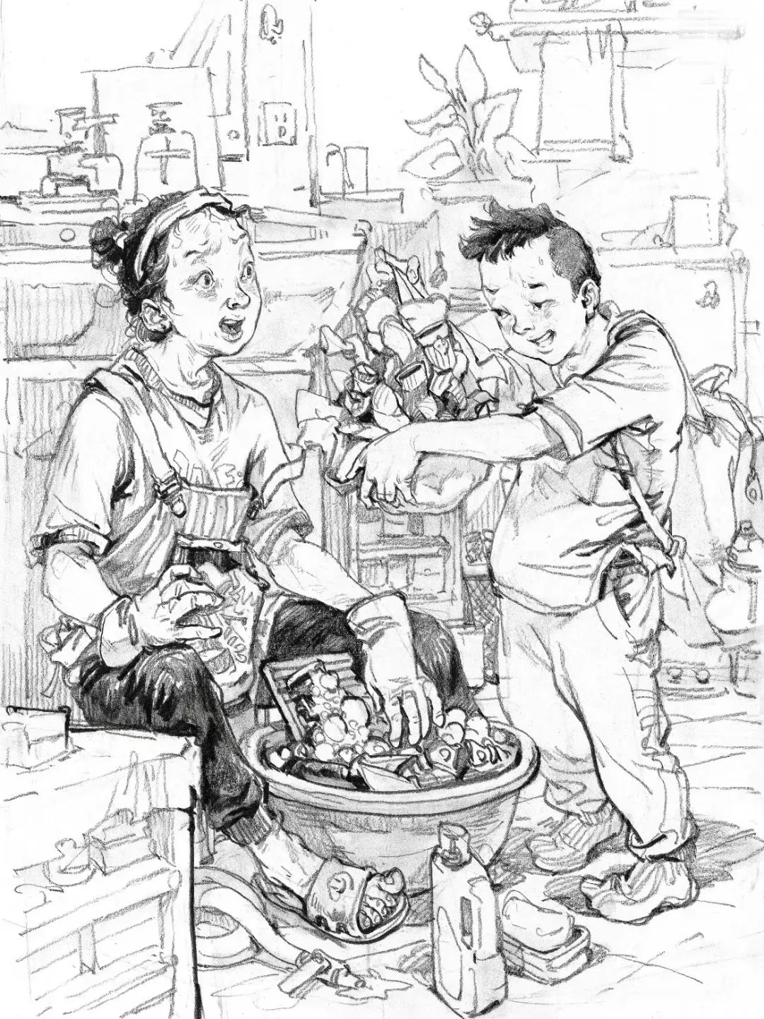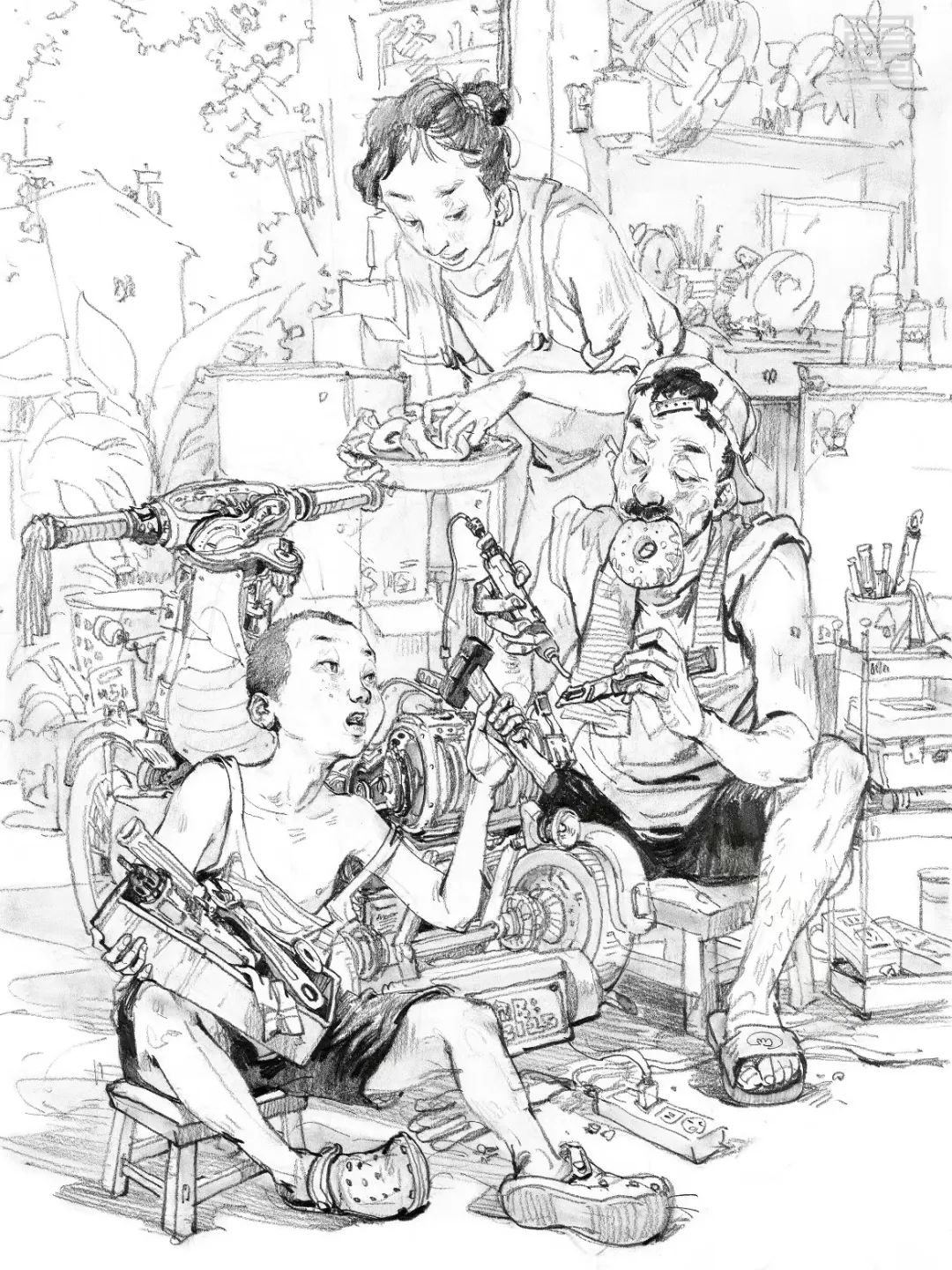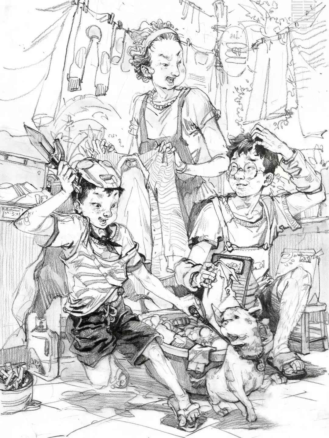 場景中的道具包括各種工具、家具陳設、人物用品、前景雜物等等。道具可以說明人物的身份、環境、時間、地點,還可以填補畫面空白,連接、建立人物之間的關系,調節畫面結構上主與次、前與后、輕與重的節奏變化。說明性的道具描寫要完整、細致,點綴性的道具可以畫得比較輕松隨意,但是要控制道具的刻畫比重,不要超過主題的分量。