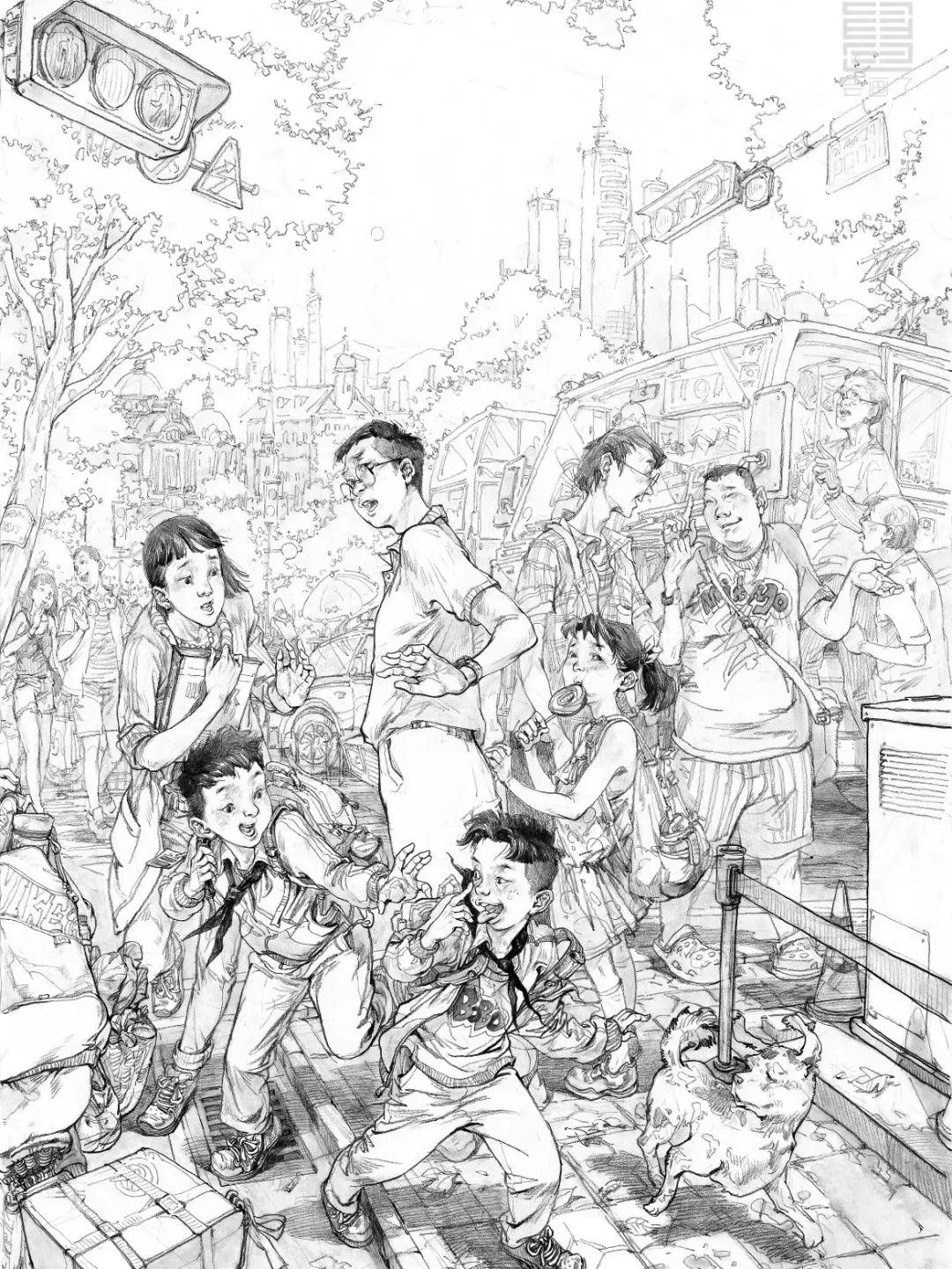 構圖是一張畫的靈魂。場景速寫的構圖要在動手下筆之前,心中有一個大體的輪廓。在速寫進行中,將對象逐一安排在預想的框架中,其中可以根據畫面的需要進行單個即興調整。場景速寫的構圖往往是夸張化的,人物占據畫面中心。周圍環繞著場景,生活氣息非常濃厚,就是你隨時可以在馬路邊看到的街景。