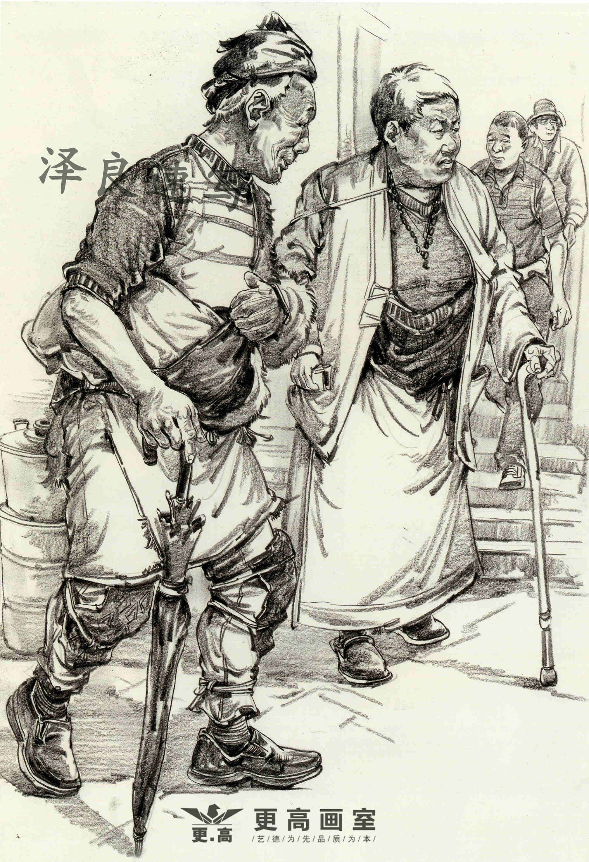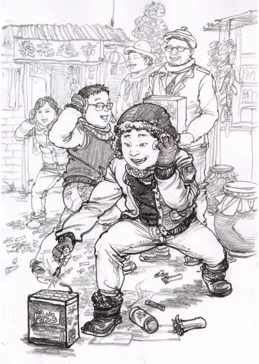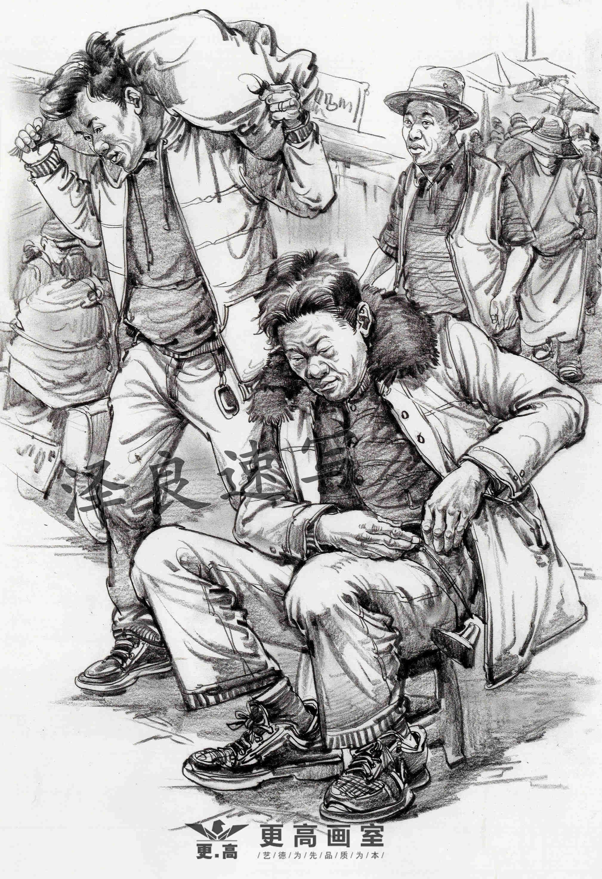 場景速寫中所指的動態是畫面中單個或組合人物的動作形態。由于場景速寫主要對象是活動著的眾多人物,眾人的動作隨時發生著不同的變化,如何在畫面中安排好人的動作變化是場景速寫中的一個重要問題。場景速寫里的人物之間要有互動的地方,包括人物的表情,是喜是悲的神態,都可以根據場景所發生的事情進行創作,能將人物的表情畫到位才是真正的高手。