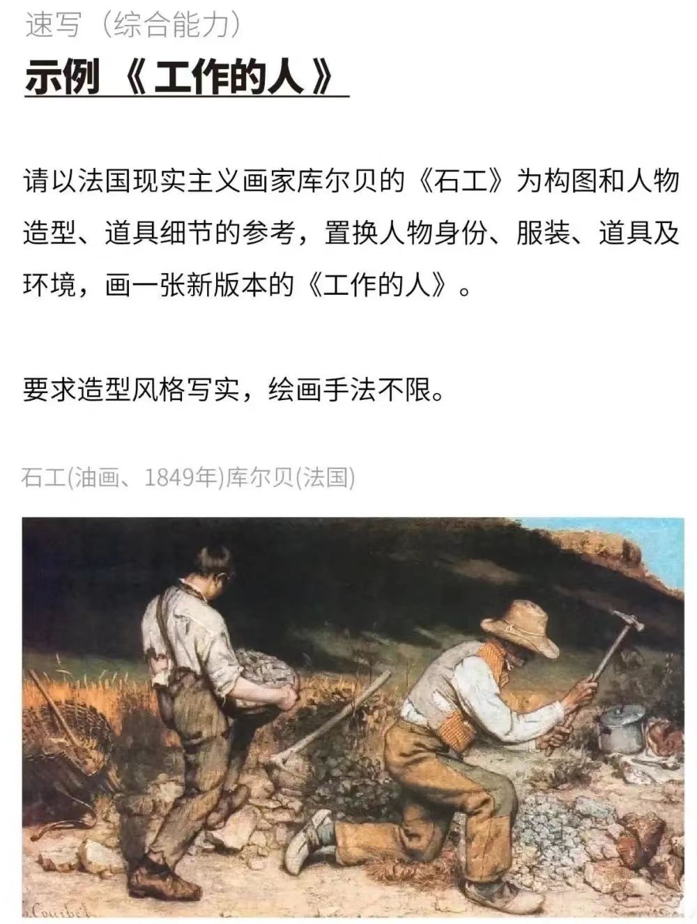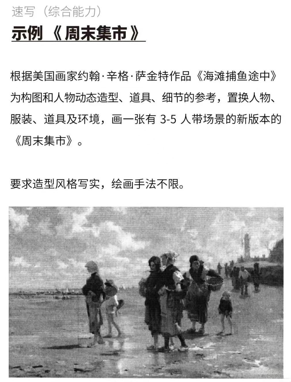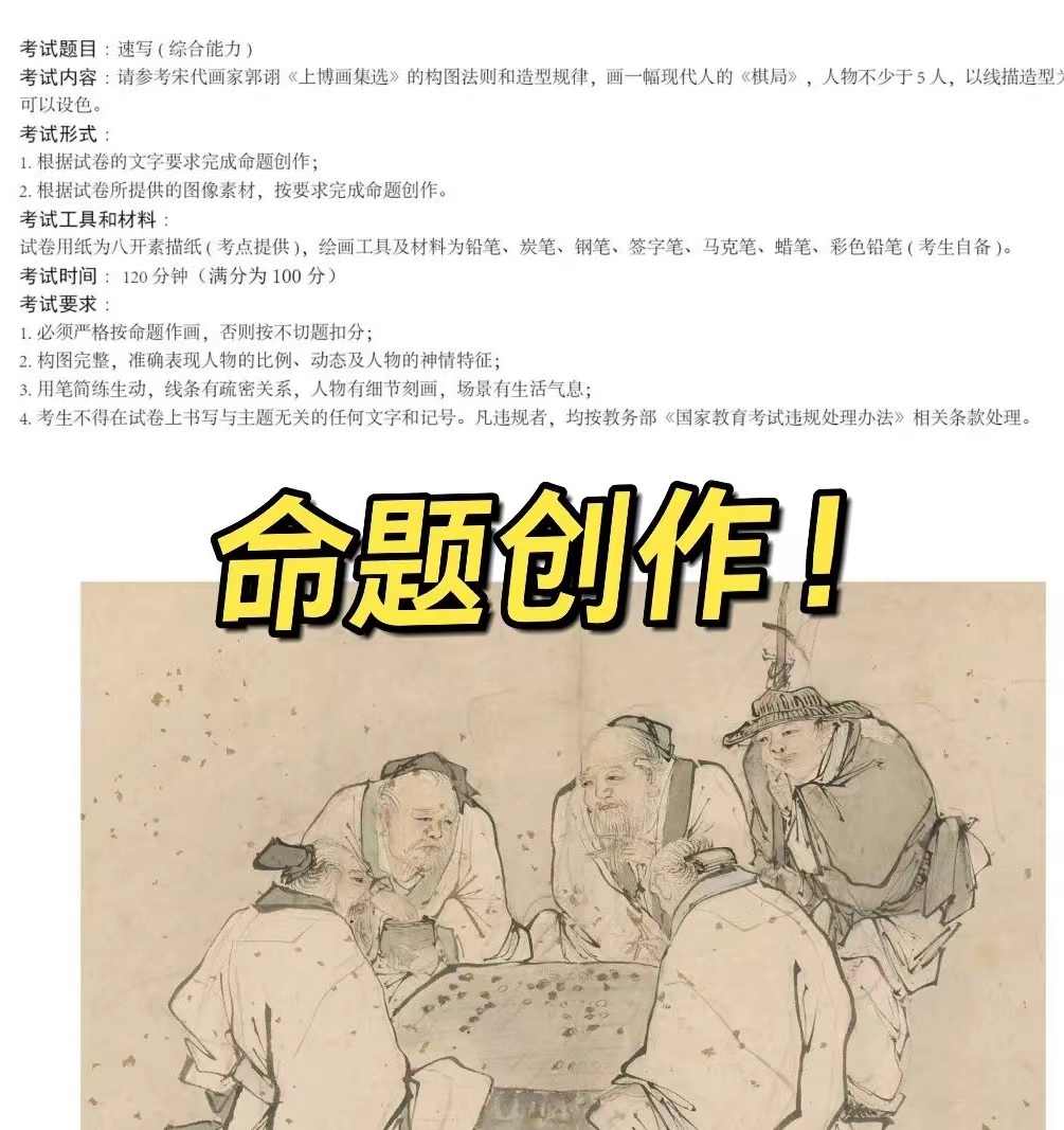 名畫置換都是會提供構圖,人物動態都會參考,你只需要根據畫面去做改動,增加你的創意就好了,相對于往年的純默寫來說,其實會更簡單一些,命題創作的考題分純文字闡述,照片+文字闡述,照片+文字闡述,你需要參考考題給到的素材圖,去基本還原素材圖的構圖,人物,動態,你要記住人物是重心,你要把人物的性別,體態,年齡,職業,這四個特征表達清楚,這樣才能貫穿主題,背景可以弱化,不要喧賓奪主。