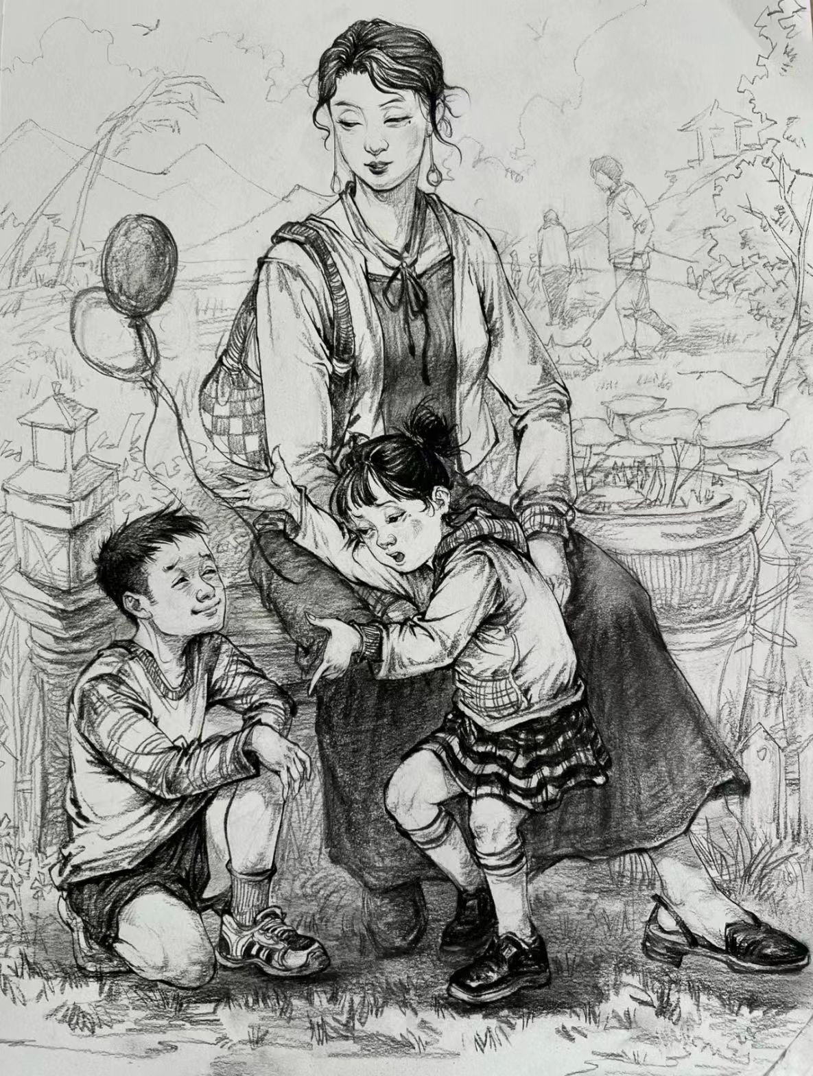如果是三個人,那么你需要重點刻畫這三個人的細節,分析他的人物動態,神態,比如他的眼睛在看向哪里或者看向誰,你要看看它的前后景關系,是環境在前呢,還是人物在前呢,參考完構圖,環境,之后再就是去置換,人物的身份,服裝,道具,以及環境,畫一幅新的主題作品,你可以把大人置換成小孩,褲子置換成裙子,玩具車置換成寵物,這些置換后的東西組合在一起,最終會串聯成一幅完整的故事畫面。