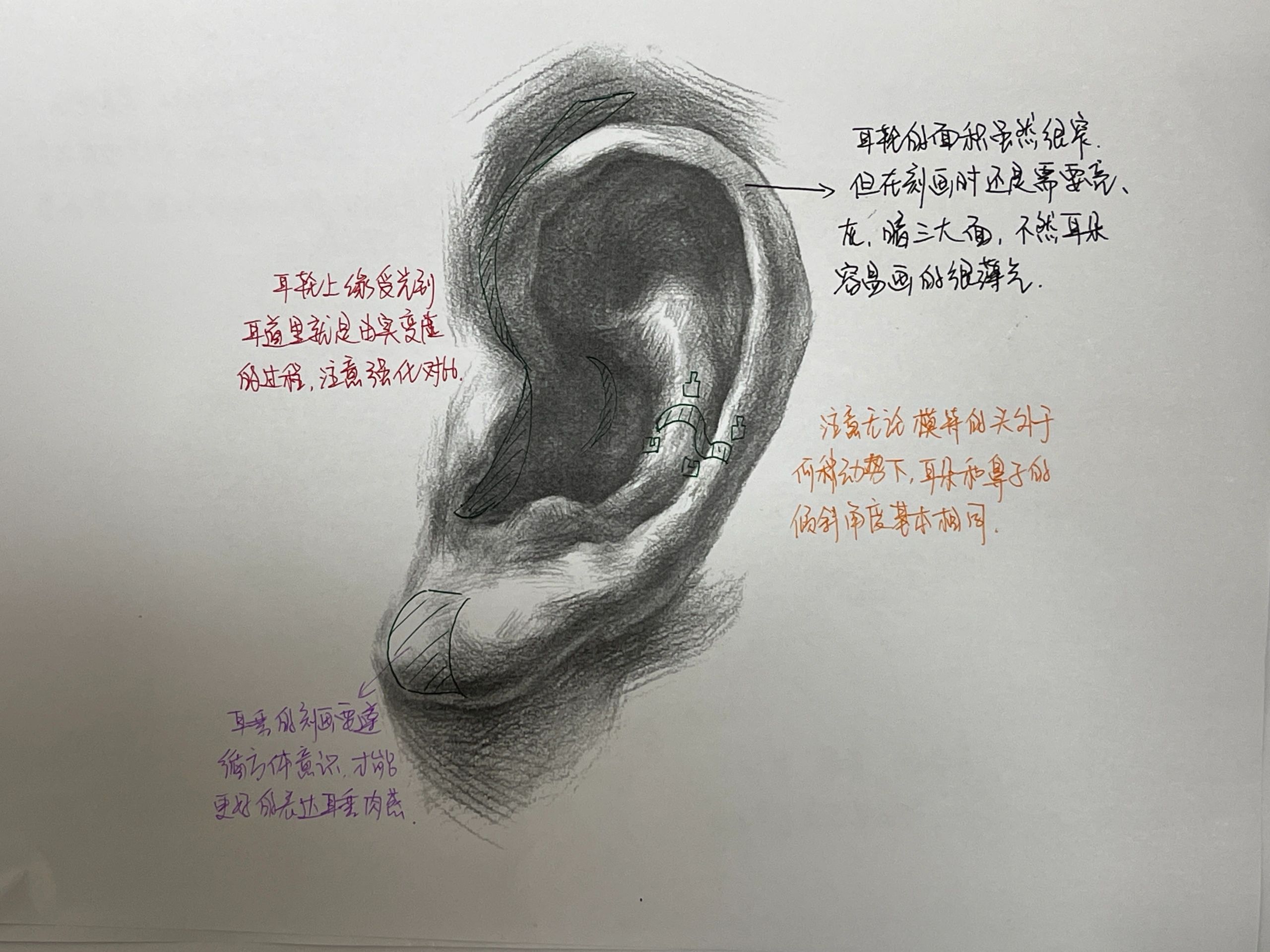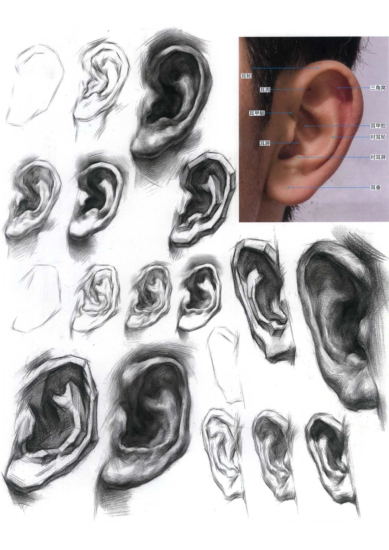耳朵呈半圓形,包含耳輪、耳孔、耳垂等結構,耳朵的刻畫程度因視角而定。畫頭像時千萬不能忽視耳朵的刻畫。耳朵因為位置特殊,常被頭發擋住,但因此也不能忽略,在刻畫時要把握好透視關系,再根據模特耳朵特征進行造型。