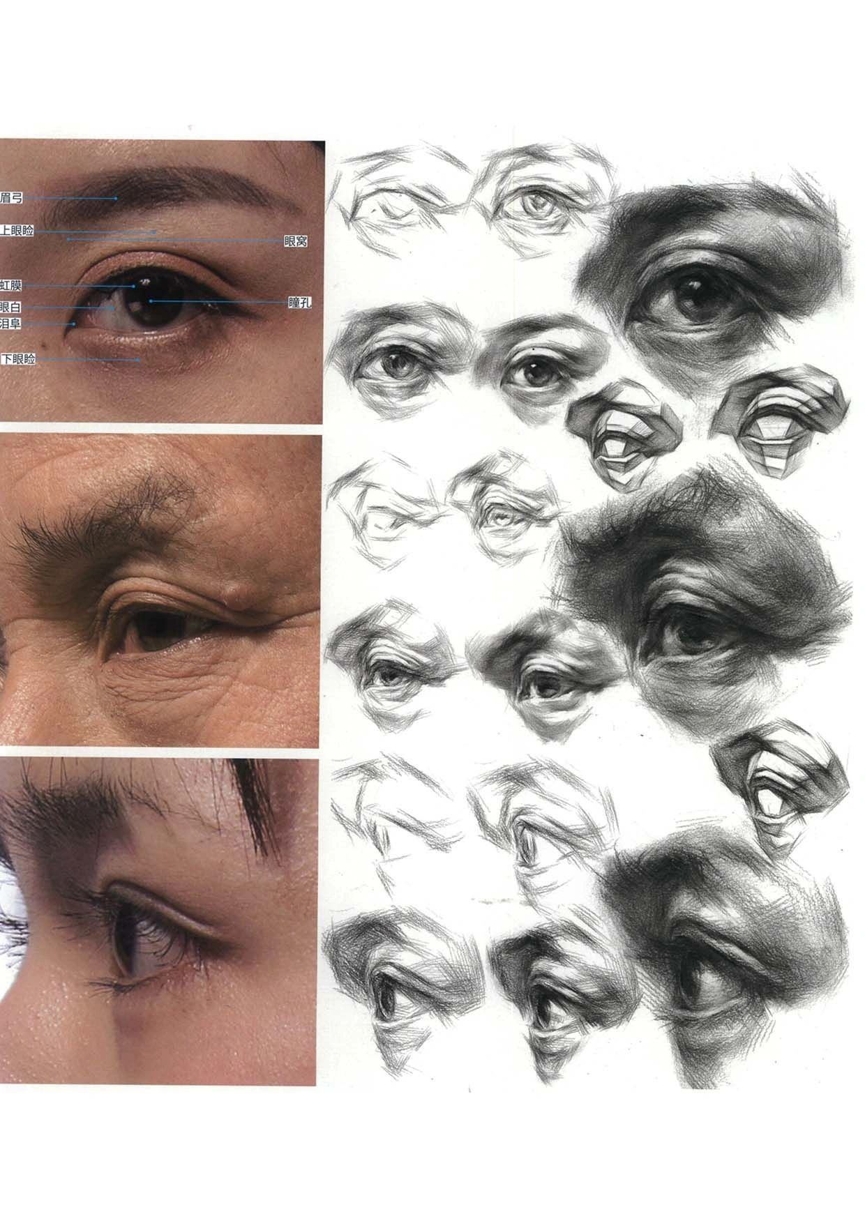 眼珠隨角度透視變化成不同的橢圓,正面最完整,全側面最扁只能看到半個面不一定能看到高光,側面和全側面一定要注意眼部有明顯的凹凸要畫出上眼皮包裹下眼皮的感覺。