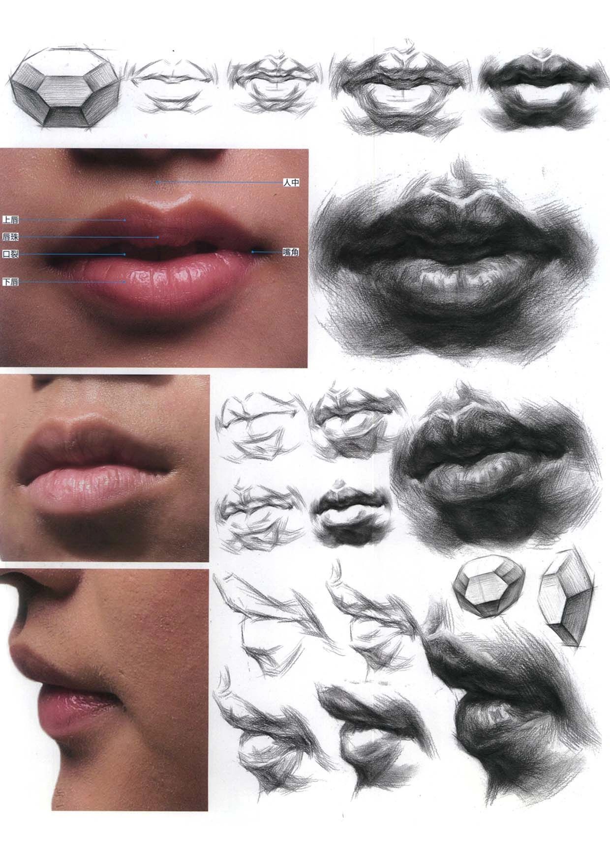 嘴唇中間實、對比強、兩邊虛、對比弱,嘴巴色彩不宜過重,亮點要突出增加體積感,嘴角可是刻畫重點。