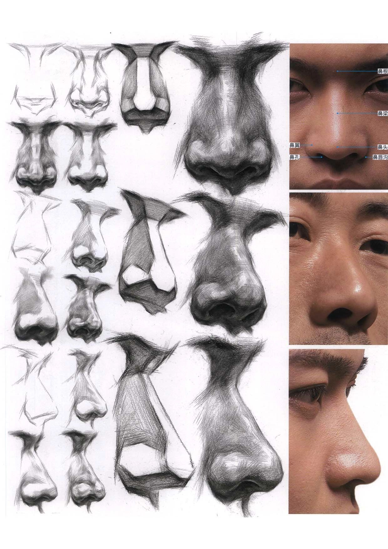 鼻子是五官最突出的器官,它由鼻根、鼻梁、鼻翼、鼻頭、鼻孔、鼻唇溝組成。畫鼻梁時注意中間和兩側三個面的形狀和變化。鼻底是難點之一,注意形狀,明暗交界線和反光,鼻子上的轉折很多,要多理解五官上的轉折變化。