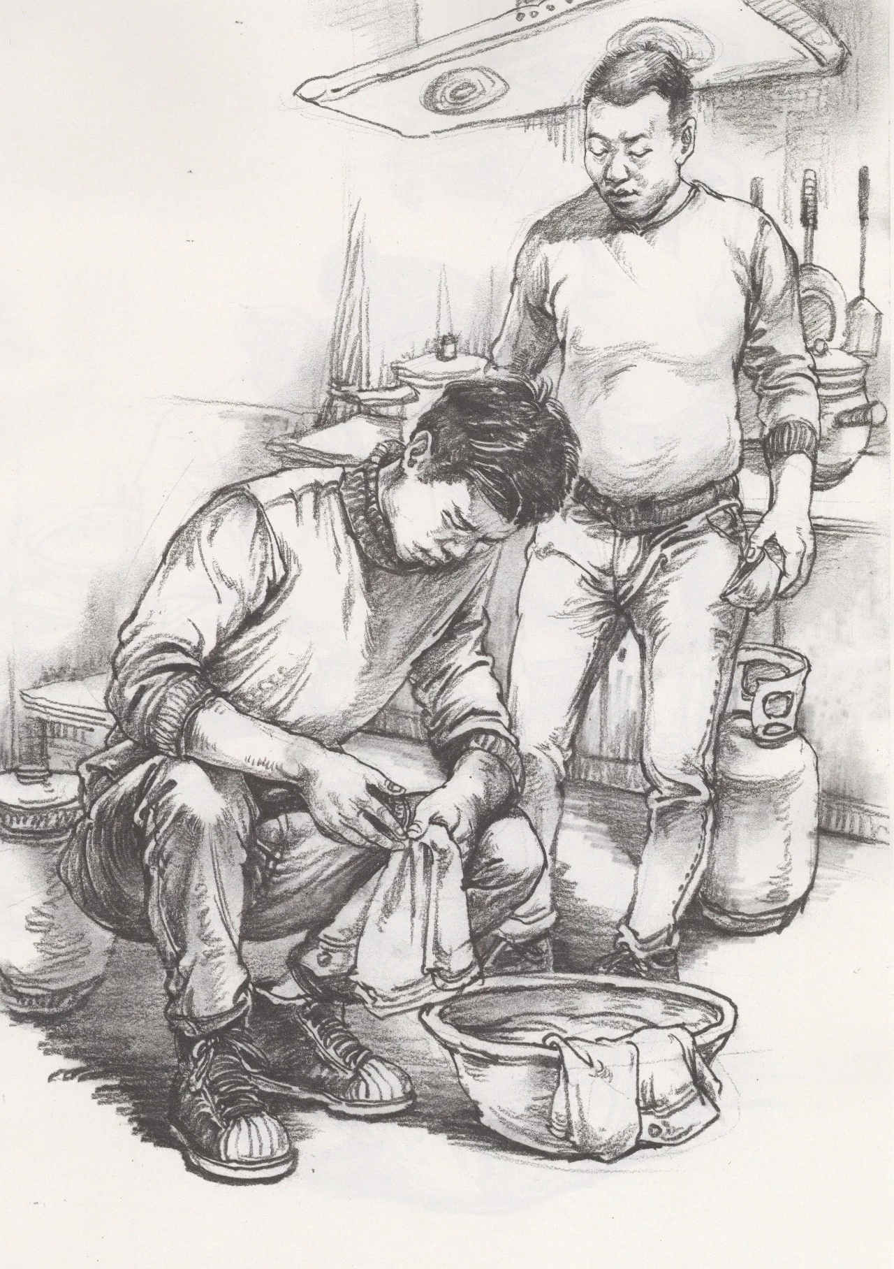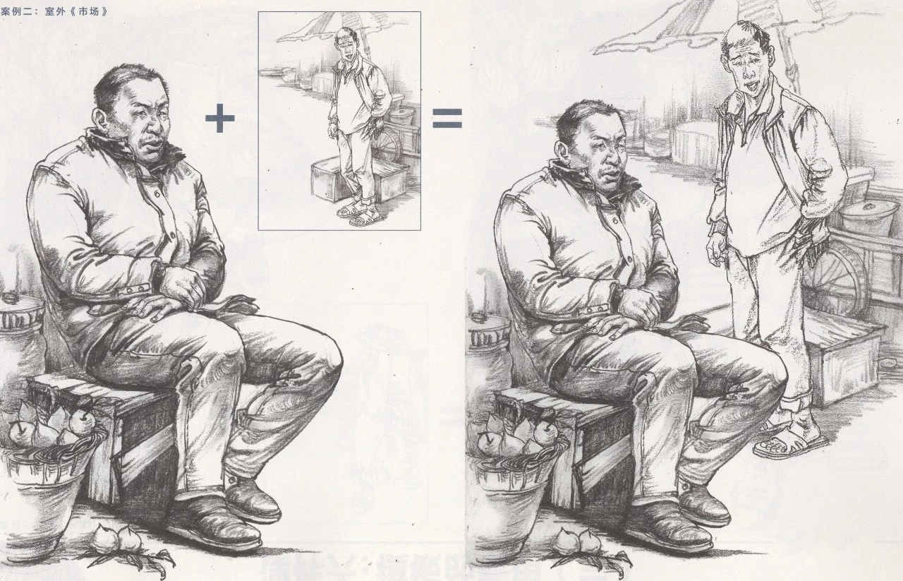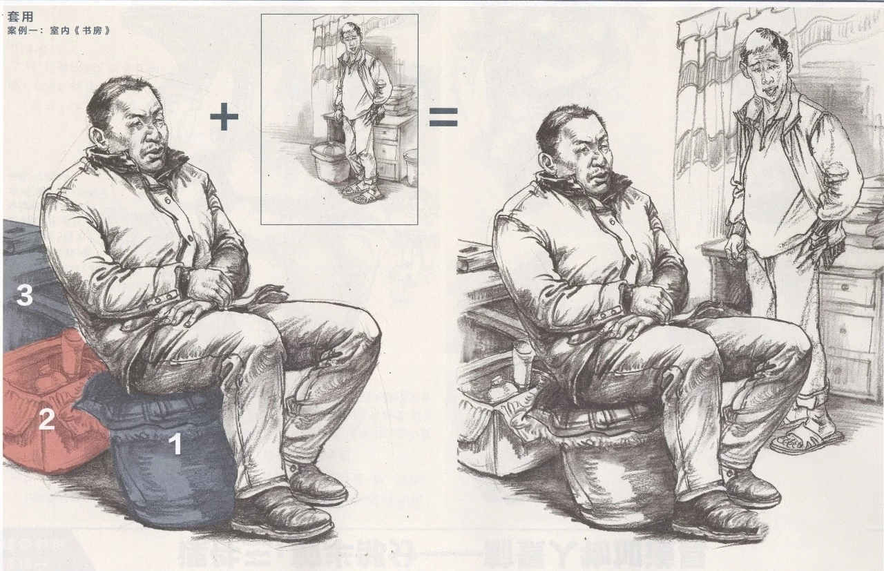 速寫中的場景模板,可以套用1,2,3原則,1擋2,2擋3,注意落地點在同一空間。另外搭配時注意道具要有高矮胖瘦的形狀組合在一起,講究點、線、面的搭配,道具就會有層次、有美感。