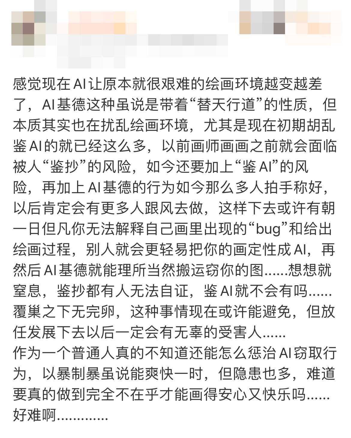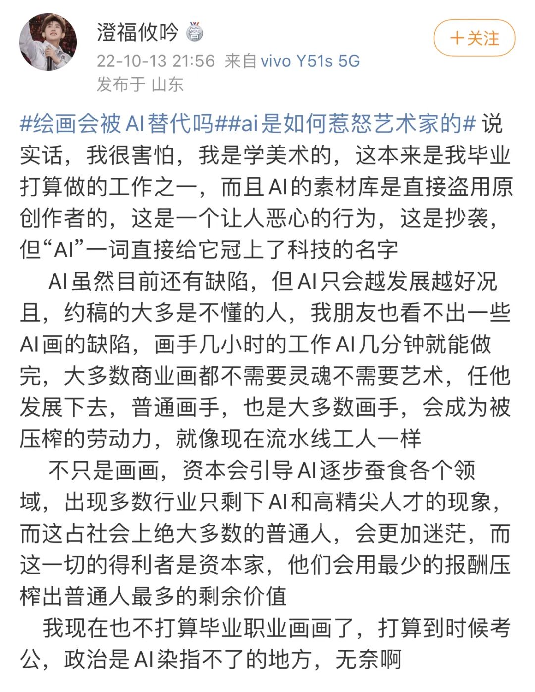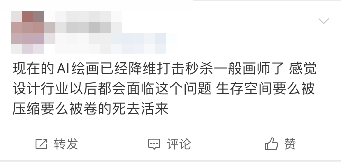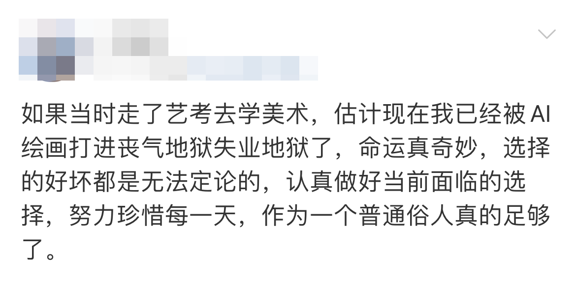 而對有志成為畫家的年輕學子來說,AI繪畫似乎也帶來了職業(yè)認同的危機。在山東就讀美術(shù)專業(yè)的學生“澄福攸吟”在網(wǎng)絡(luò)平臺上表達了對未來職業(yè)生涯的憂慮與恐懼,她覺得自己成為職業(yè)畫師的理想將要破滅在現(xiàn)實面前。