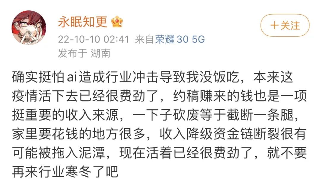 2022年開始,面對“AI繪畫”這個闖入者,確實有不少畫師開始擔心自身地位難保。畫師“永眠知更”擔心AI繪畫的出現(xiàn)會減少自己的約稿量:“約稿賺來的錢也是一項挺重要的收入來源,一下子砍廢等于截斷一條腿?!?/span>
