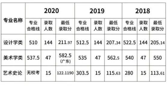報考設計學類的考生,語文和外語成績均要求不低于90分(150分制);報考美術學類的考生,語文成績要求不低于80分(150分制)、外語成績要求不低于70分(150分制)。特別的,單科成績不過線且單科分差不超過5分的考生也可以報考,但須從文化課總成績中減去一定分數后再參與排序,單科成績每相差1分,文化課成績(750分制)減去5分,以此類推,文化課成績最多減50分。最終綜合成績或文化課成績仍在錄取線之上的予以錄取