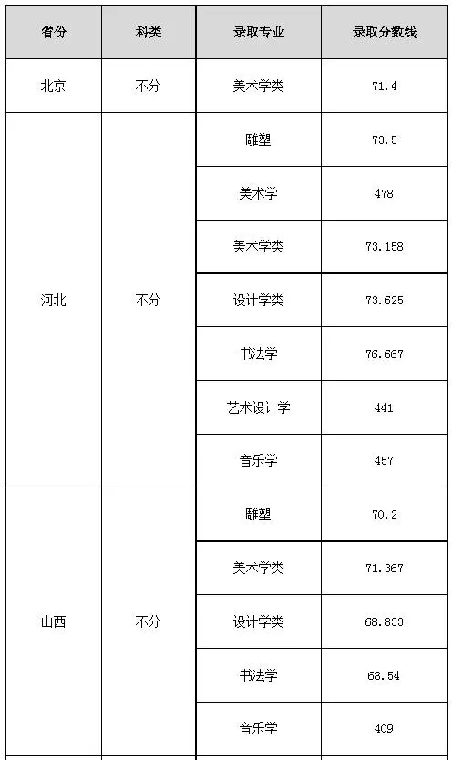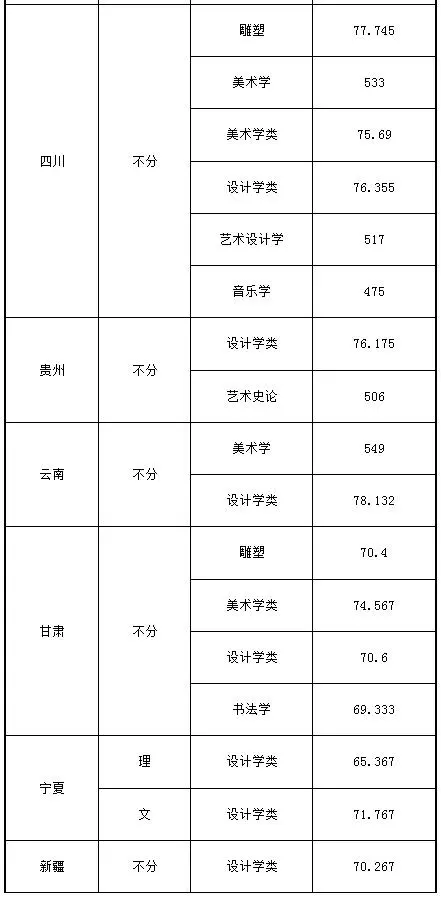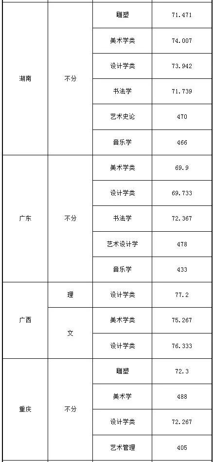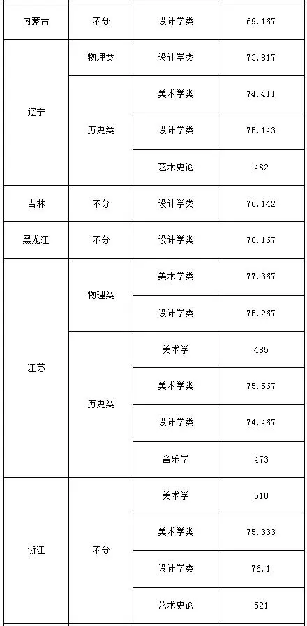注:1.按遼寧省、河南省、湖南省的錄取規(guī)則,美術學類、設計學類、雕塑、書法專業(yè)的綜合分計算方法為:綜合分=文化總分×0.067+省統(tǒng)考總分×0.167。