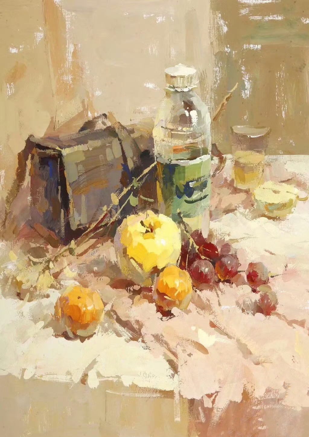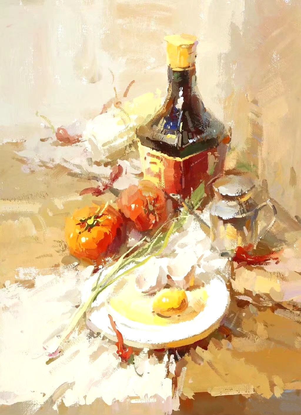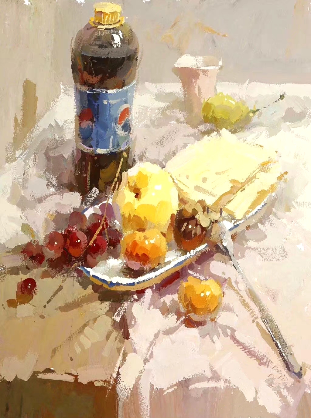物體造型要結(jié)實(shí),外輪廓要虛實(shí)結(jié)合,掃出去的顏色力量要小一些,不要太大面積。鋪色時(shí)畫好固有色和環(huán)境色,豐富反光的環(huán)境色要添加少許冷色掃上去。重的地方要卡一卡,要自然一些,不要太跳了。