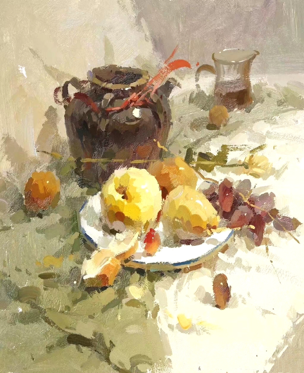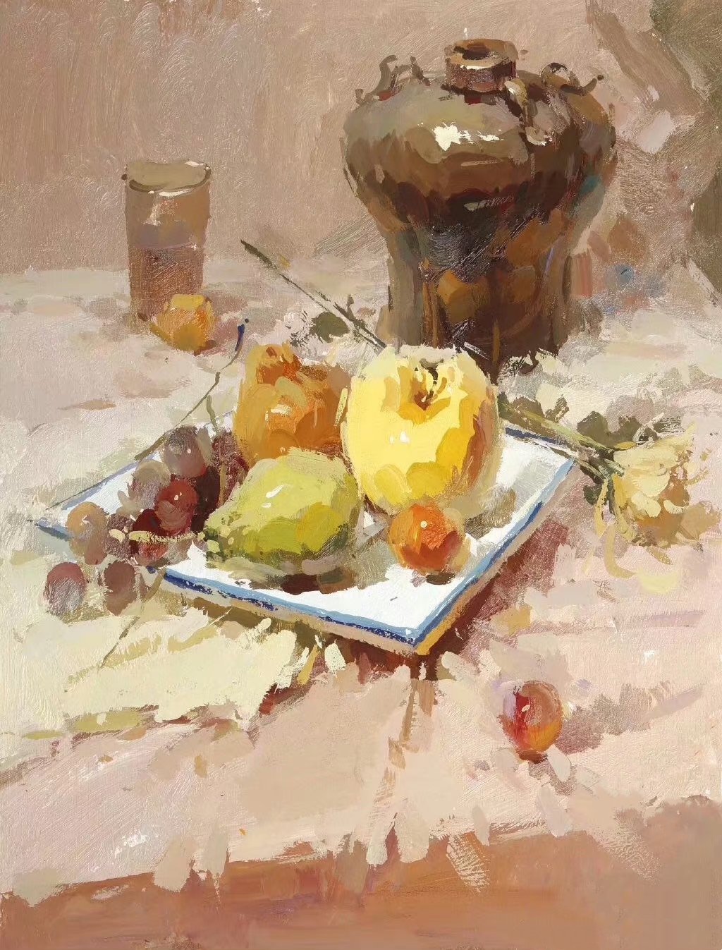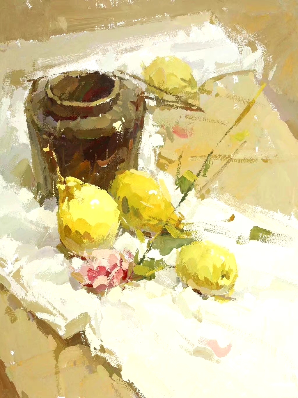 物體造型要結(jié)實(shí),外輪廓要虛實(shí)結(jié)合,掃出去的顏色力量要小一些,不要太大面積。鋪色時(shí)畫好固有色和環(huán)境色,豐富反光的環(huán)境色要添加少許冷色掃上去。重的地方要卡一卡,要自然一些,不要太跳了。